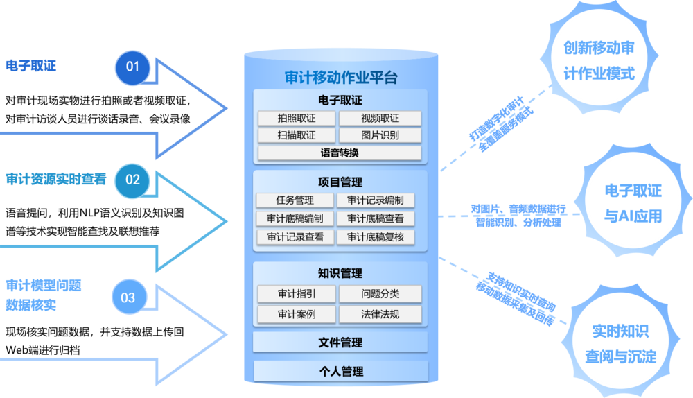 可以采集视频、语音、图片等文件资料,这些文件资料可以及时上传到数字化审计平台中作为审计证据,可实现一键式扫描、拍照、录音等取证功能,并可对图片、语音进行文字转换。
